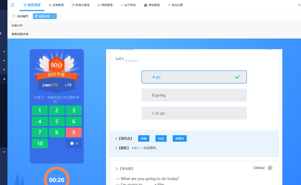 教师可以在后台进行试卷分析,查看学员答题详情: