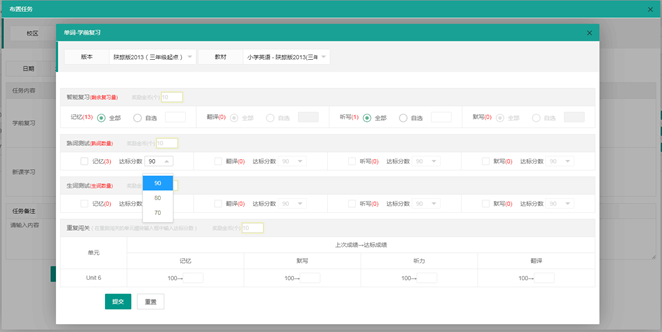 布置任务的内容有:学前复习、新课学习,教师后台可根据学生复习数量设置复习任务和各类测试。