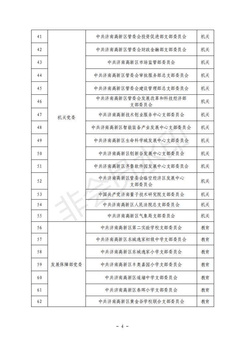 根据《济南高新区基层党组织星级管理办法(试行)》(济高办字〔2018〕37 号)有关规定,聚焦基层党组织班子建设、党员队伍建设、制度建设、基础保障、工作业绩等方面,通过“自下而上、上下结合,逐级申报、逐级审核、统一评定”的方式,评定出济南高新区 2020 年度五星级党组织 159 个、四星级社区党组织 17 个、四星级村居党组织 52 个(详见附件)。各直属党(工)委要按程序做好考核奖励发放工作,进一步树好典型标杆,强化示范引领,凝聚干事创业、奋勇争先正能量,切实提升全区基层党建工作水平。