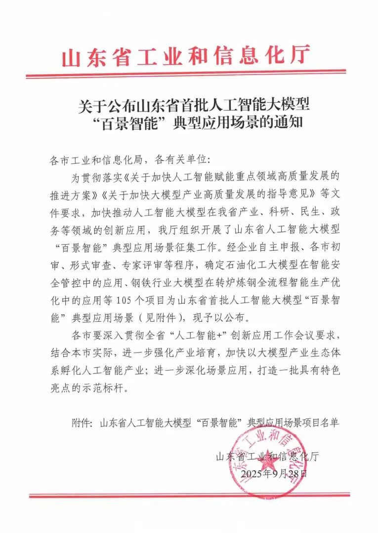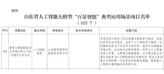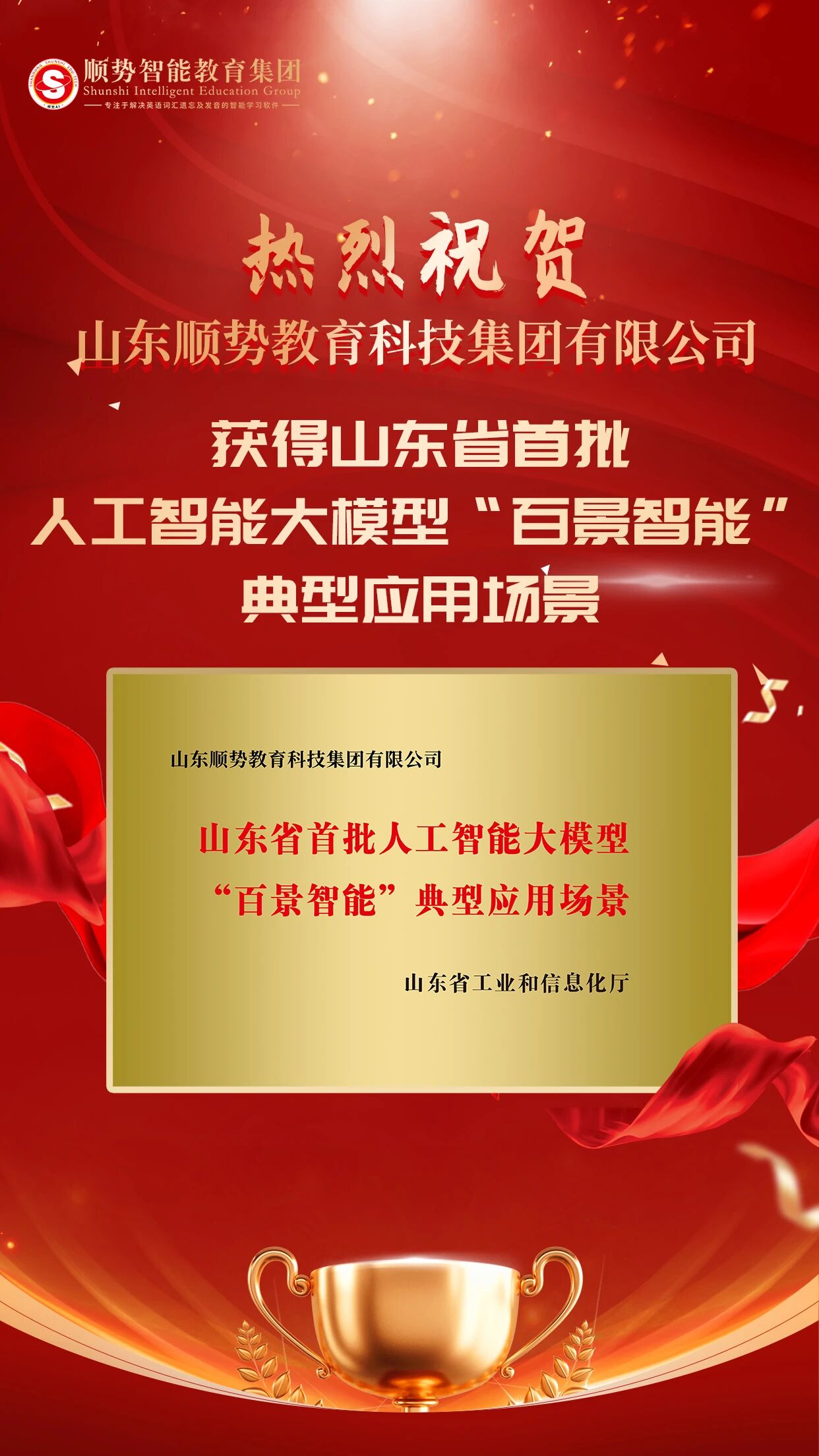 近日,山东省工业和信息化厅公布了2025年度首批人工智能大模型“百景智能”典型应用场景名单,山东顺势教育科技集团有限公司申报的“教育大模型赋能动态学情分析与个性化教学方案生成”场景成功入选。这一荣誉是对顺势智能教育集团技术创新实力的高度认可,更肯定了公司作为“人工智能+教育”领域先行者的探索价值与实践成果。