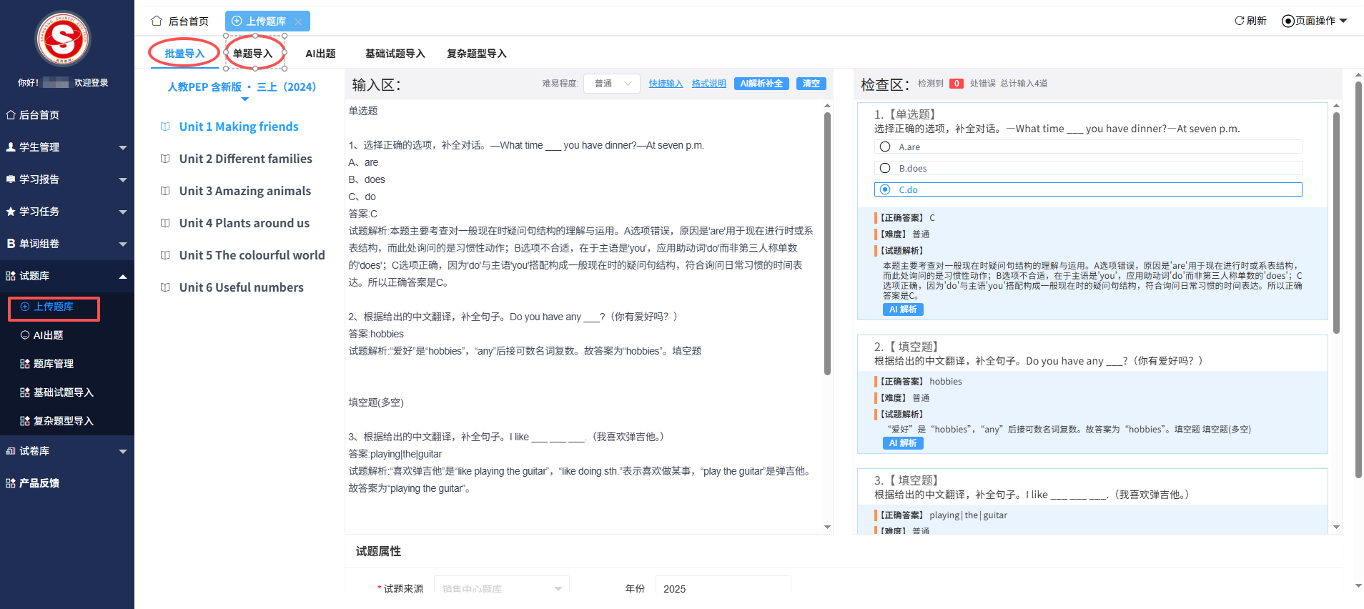 支持 “批量导入” 与 “单题录入” 双重模式,适配多类常见格式,无需复杂格式调整即可完成题目上传,大幅提升试题上传效率。