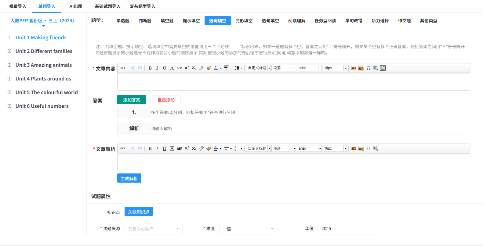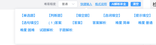 针对选句填空题型,备选项可自动从题干提取;阅读理解批量添加场景中,支持从文档复制内容自动转换为标准格式,彻底省去手动录入的繁琐,进一步降低操作门槛。