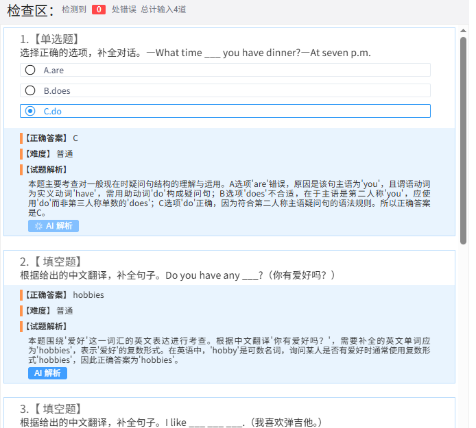 无论单题还是批量导入,系统均搭载 AI 解析功能:针对客观题、主观题均可自动生成多维度完整解析,且解析与题目直接绑定存储。学生作答后能即时查看解析,助力形成 “练习 - 解析 - 提升” 的闭环学习生态,减轻学管师手动编写解析的负担。