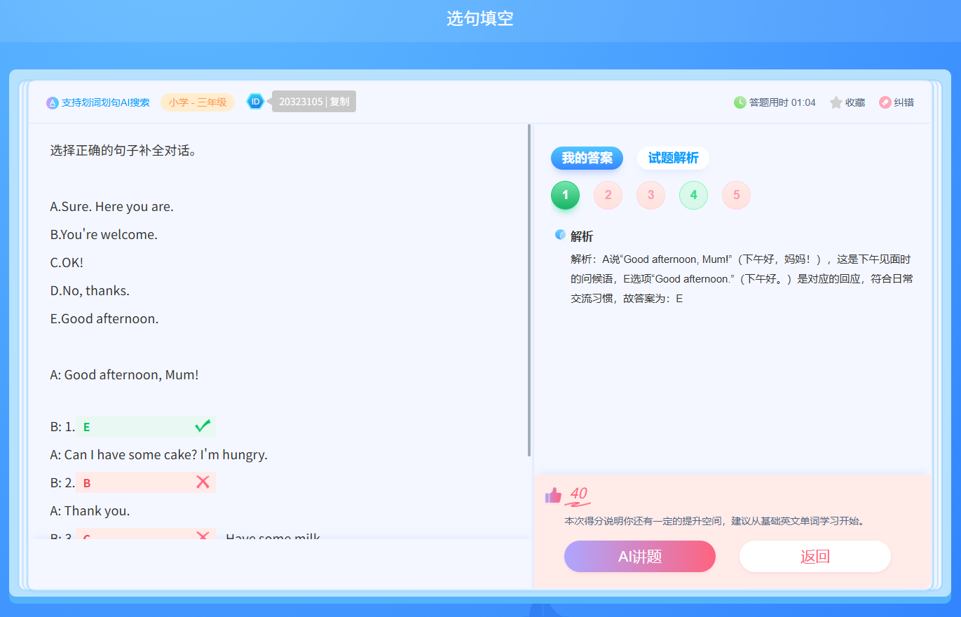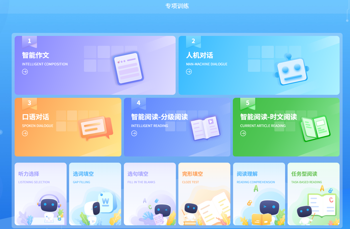 专项训练模块聚焦听力选择、选词填空、选句填空和任务型阅读 4 个题型的 UI 升级,同步优化各题型配套功能界面,全方位提升答题体验: